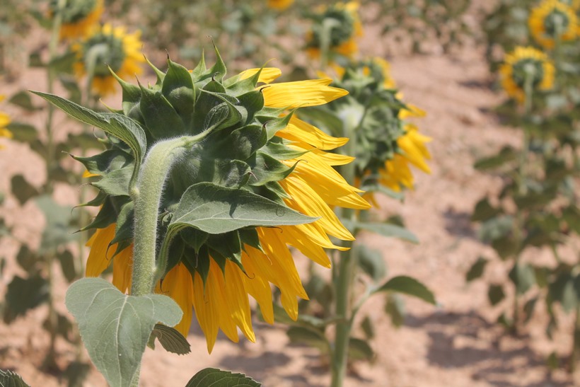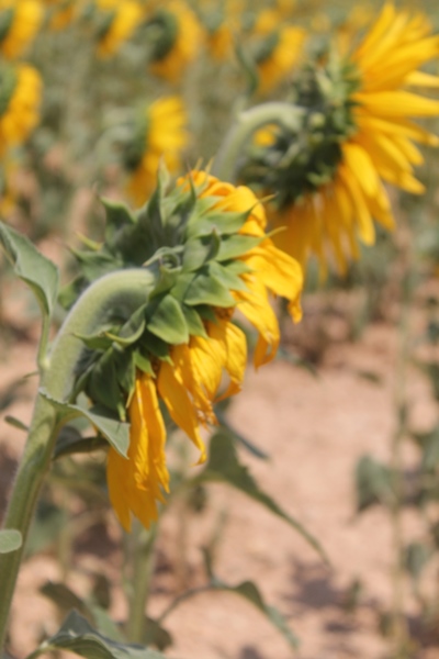 Y esas hileras tan rectas que se ven entre cada surco de girasoles, parece que invitan al visitante a caminar entre ellos, a confirmar de cerca la perfecta forma de la flor.